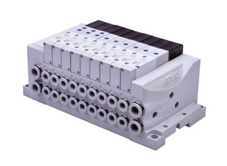 Manifold for 6D 200 series, 19 stations, 8mm tube port size, 12mm in/out port size, DC12V, Single Solenoid 5 way/2 positions, 19 Pieces